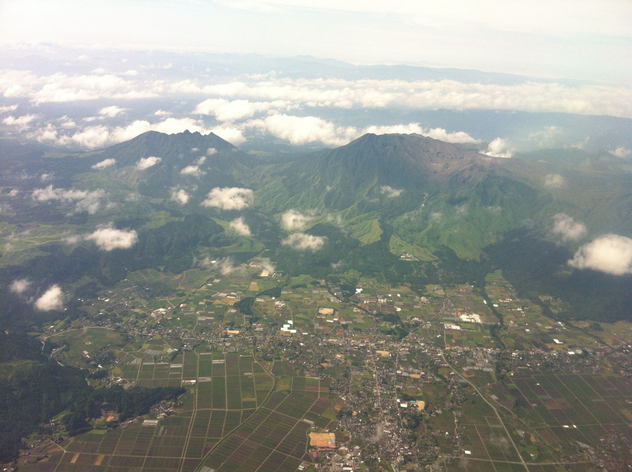 大分県久住上空に。私が見ているのは進行方向に向かって左側の窓です。右側の窓には久住連山が姿を見せています。