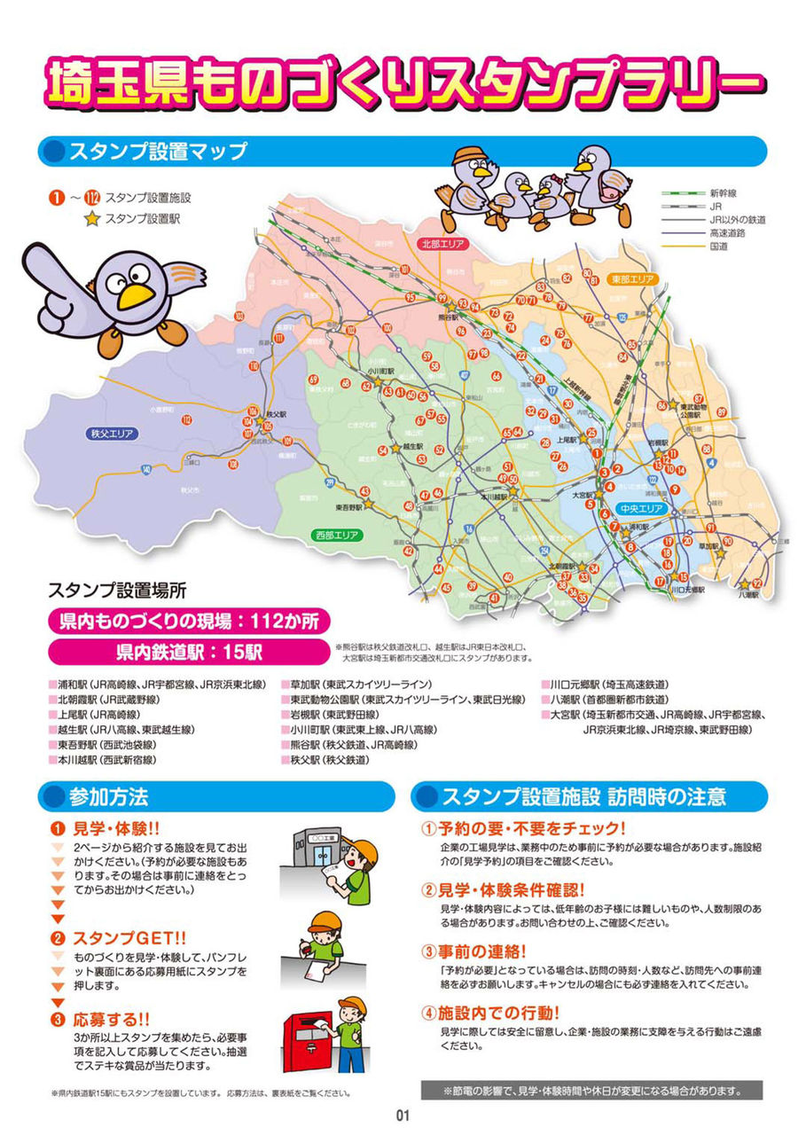 これは県内の工場などを巡り、見学や体験をする企画で、県内112箇所の施設と15箇所の駅にスタンプを設置してまわる企画です。参加した後に応募すると埼玉県産の豪華賞品が当たる抽選もあるようです。
