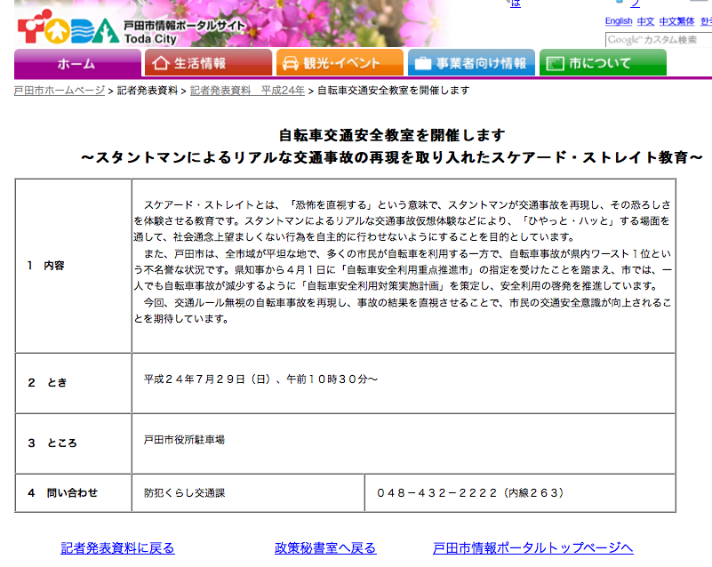 戸田市も、残念ながら、埼玉県内で人口に占める自転車事故の割合がワースト1位になってしまったことから、埼玉県から平成24年度の「自転車安全利用重点推進都市」に位置づけられてしまいました。