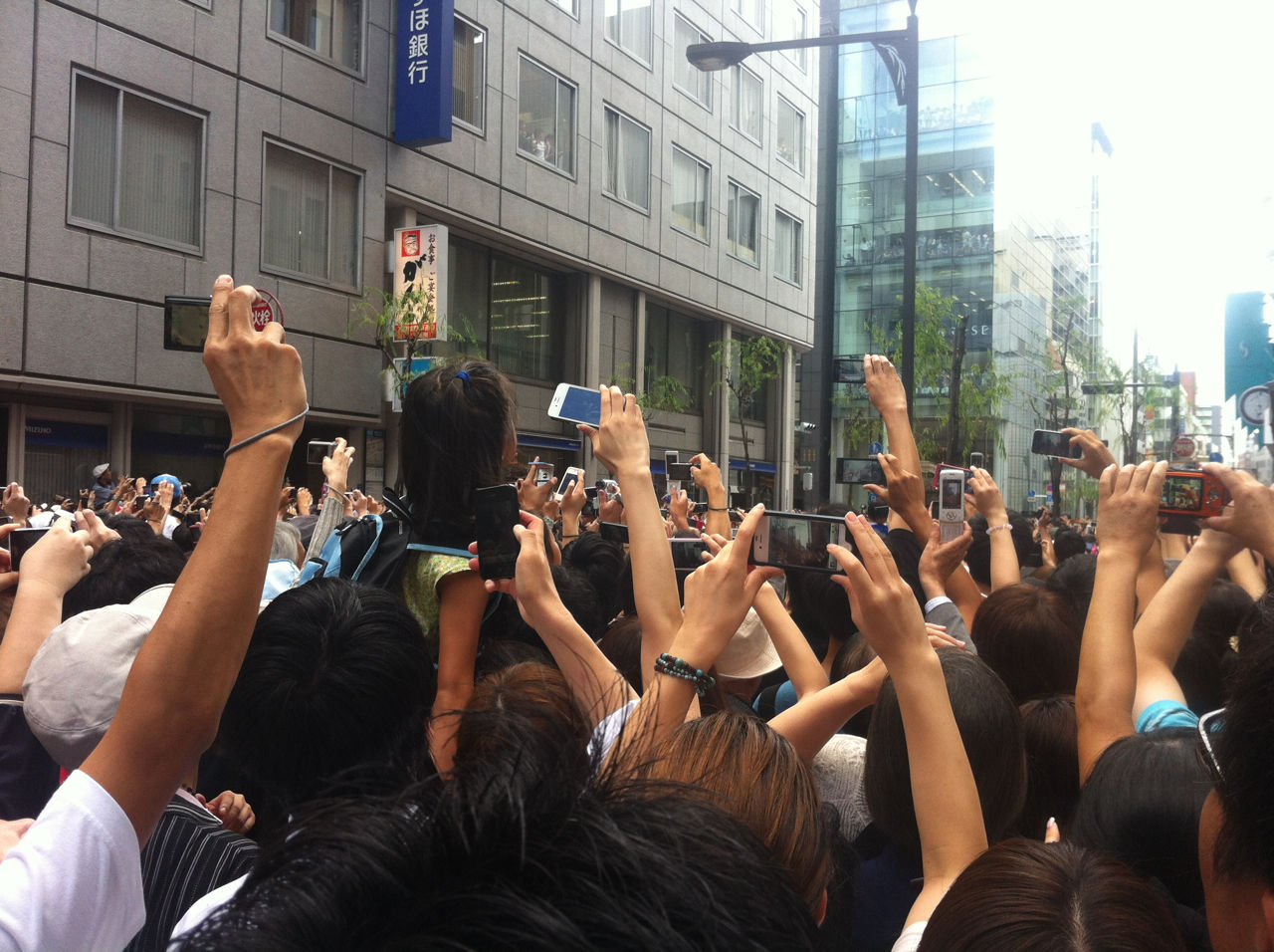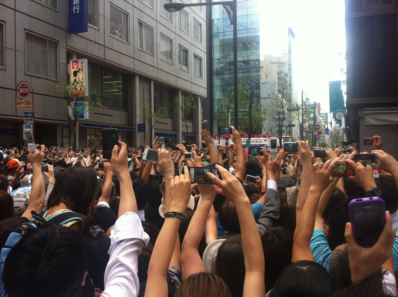 パレードが近づいてきました。でも、実は人の手が邪魔になってよくみえません。しかし、キャー!なでしこ〜!、内村くーん!など歓声が沸き起こったので、誰がやってきたのかはわかりました。