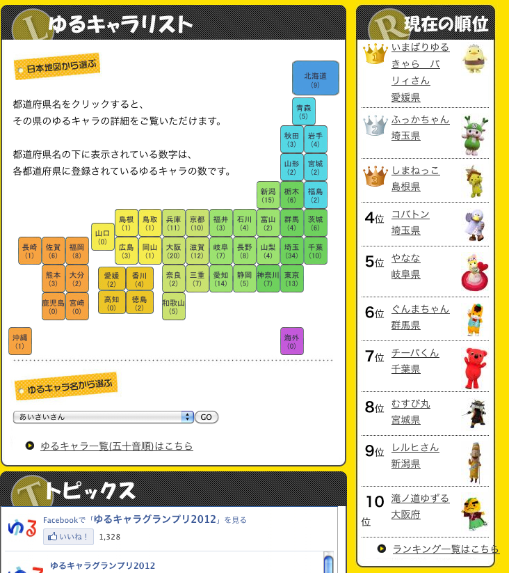 昨年は熊本県のサプライズキャラクター・くまモンが1位をとった「ゆるキャラグランプリ」、2012年も始まりました。
