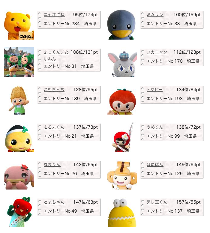 昨年グランプリのくまモンは今回は応援団にまわったため候補ではありませんが、今年も多くのゆるキャラがエントリーしています。