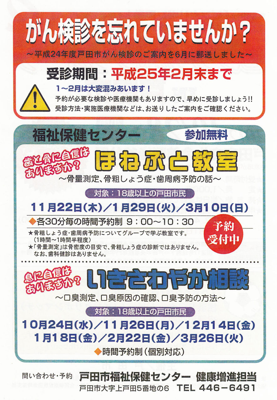 参加希望者は、戸田市福祉保険センター健康増進担当まで申込みとのこと(電話 048-446-6491 10月1日から予約開始です)。
