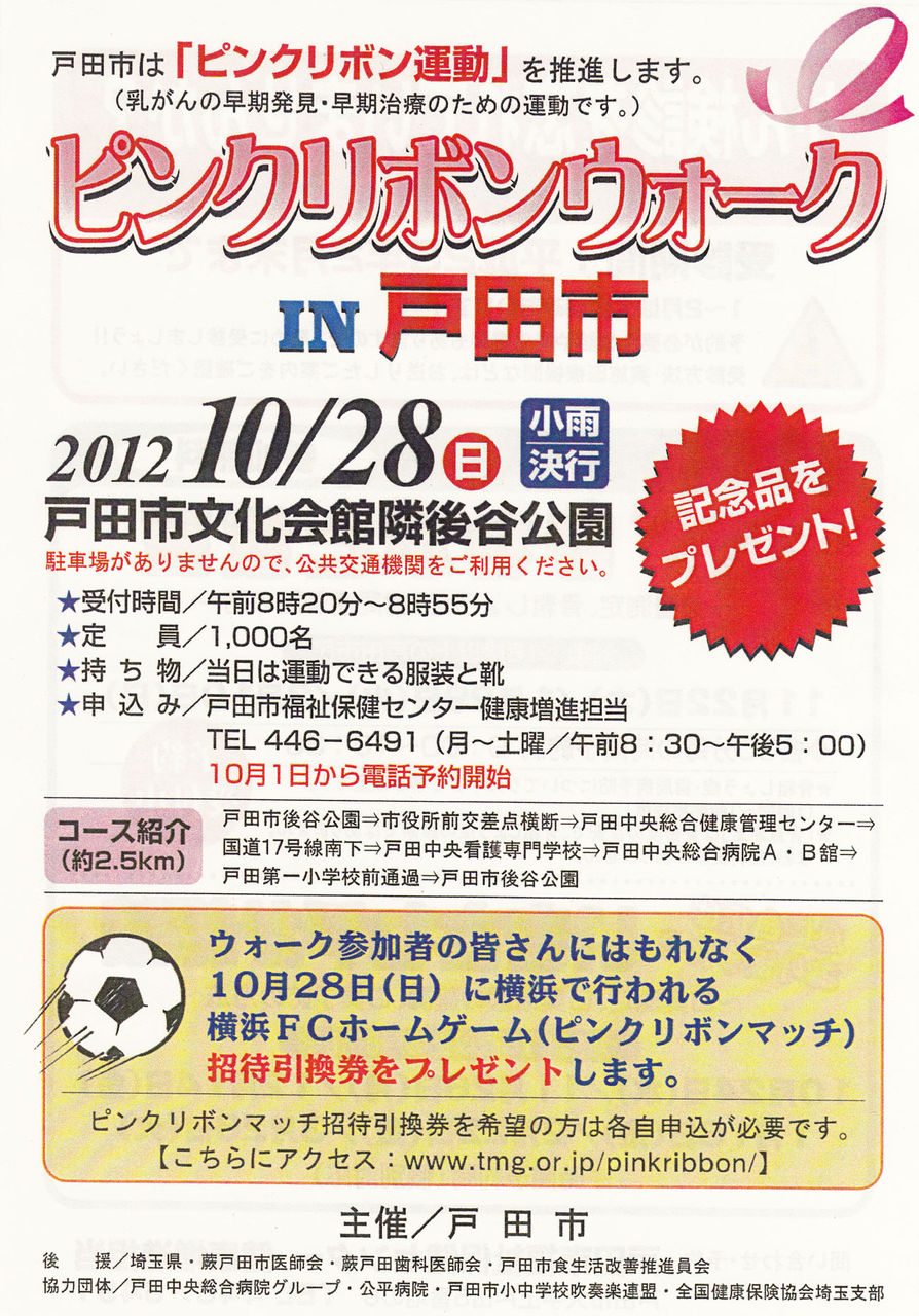 昨年は、戸田市役所東側駐車場を会場として、ピンクリボンウォークのスタート&ゴールならびに森口博子さんの協賛コンサートが開催されましたが、今回はその場所が市役所の免震工事の資材置き場となるため使用できず、後谷公園からスタートいたします。