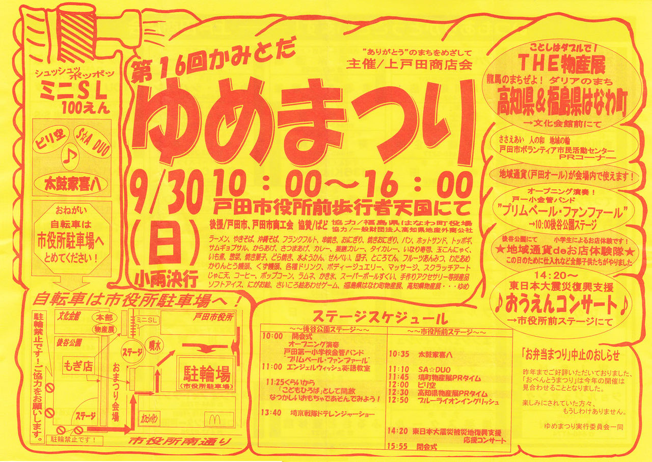 上戸田ゆめまつりについて、詳しくは、以下ちらしをご覧下さい(クリックすると拡大表示します)。