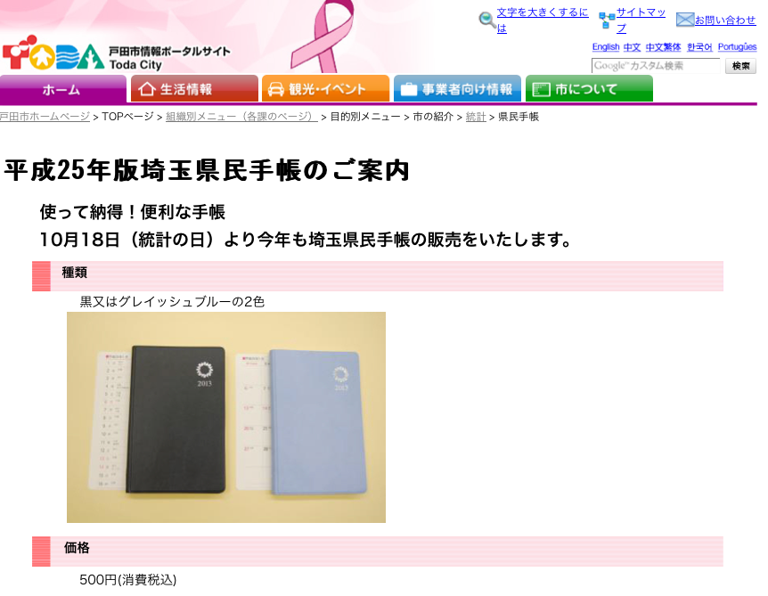 ・・・すみません、脱線してしまいましたが、埼玉県民手帳、戸田市では市役所1階の情報統計課さんで販売されるとのこと。1冊500円です。