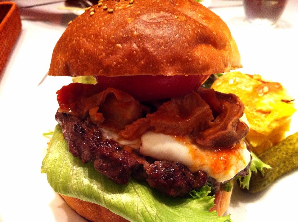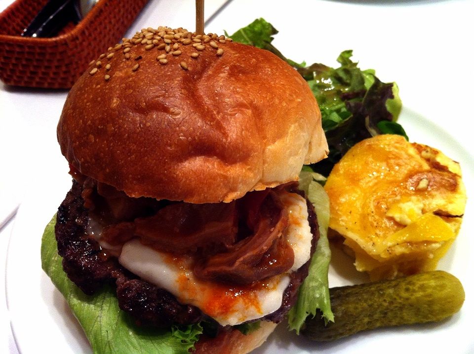 ここで食べたのは、写真のモツチーズバーガー。手作りハンバーガーに牛もつとモッツァレラチーズがトッピングされています。