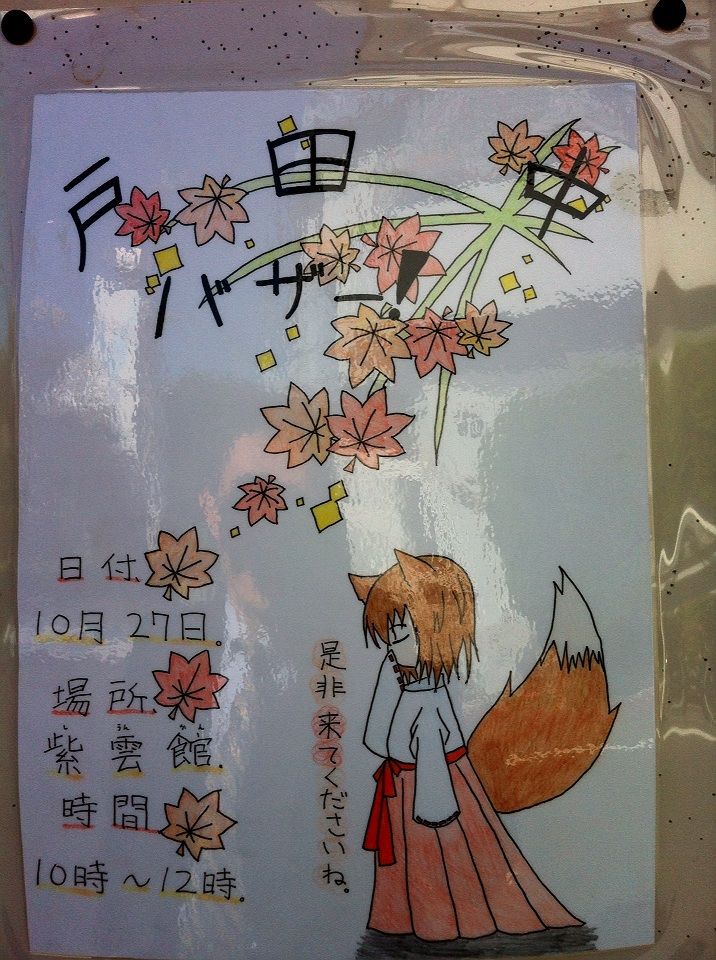 2012年10月12日 戸田市立戸田中学校で10月27日にバザーが開催されます 10月、11月と毎週何かしら行事が行われている戸田市ですが、10月27日に戸田中学校でバザーが開催されることが告知されていました。 時間は10時から12時までで場所は戸田中学校の紫雲館とのこと。 ちょうどこの日は朝から戸田市役所西側でも戸田商工祭が開催されています。 ちょっとだけ離れていますけど、どうぞ戸田中学校にも足をお運びくださいませ。 それにしても、なんとも可愛らしいポスターではありませんか!中学校の生徒さんが一所懸命に作られたんでしょうね。 「お知らせ」カテゴリの最新記事 < 前の記事次の記事 > コメント コメントフォーム 名前 コメント 評価する リセット リセット 顔 星 投稿する 情報を記憶 トラックバック