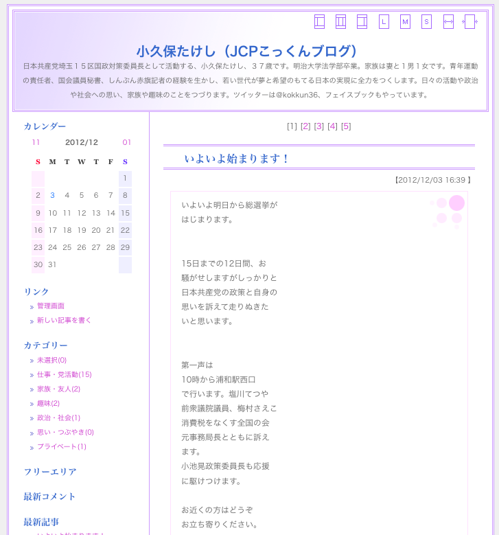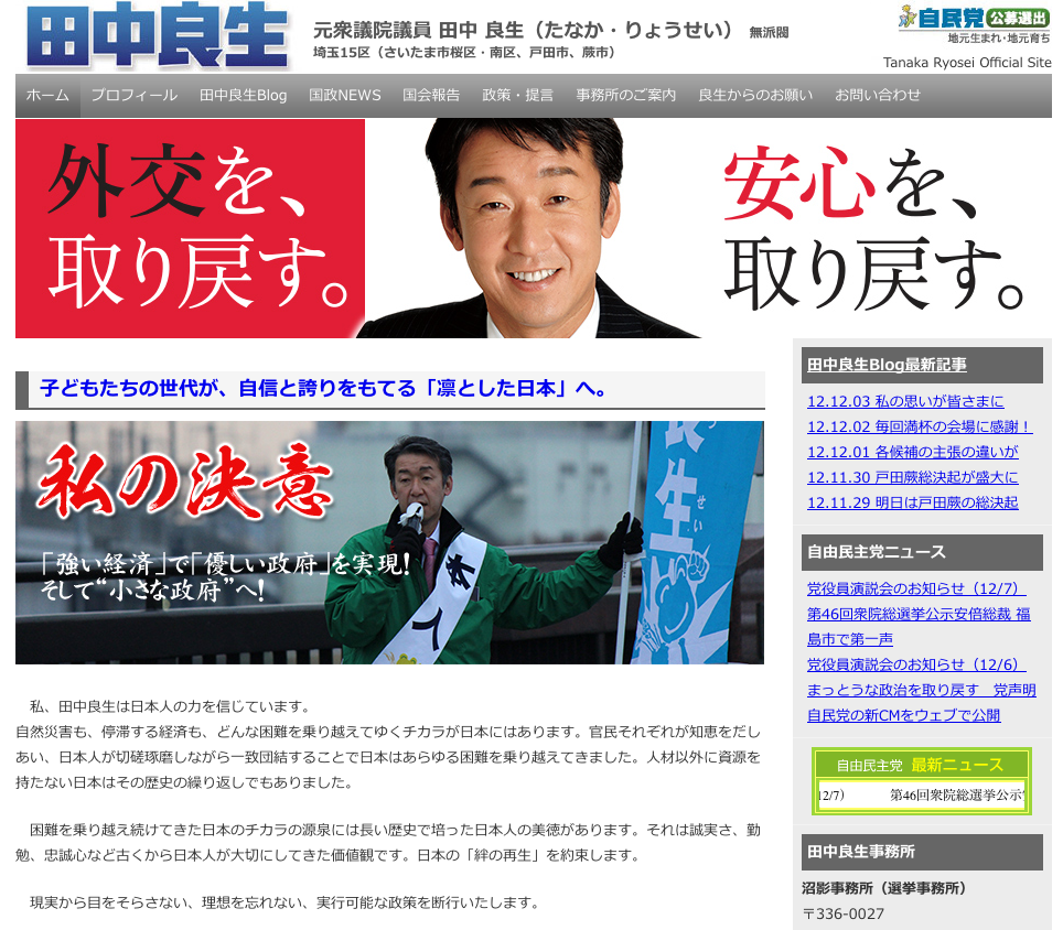 今日は個人的な意見を書かず、皆さんに判断いただく材料のひとつとして、各候補者のサイトをリンク紹介いたします(ウェブサイトの画像はMac・Firefoxでの表示です。クリックするとそれぞれのサイトが新しいウィンドウで開きます)。
