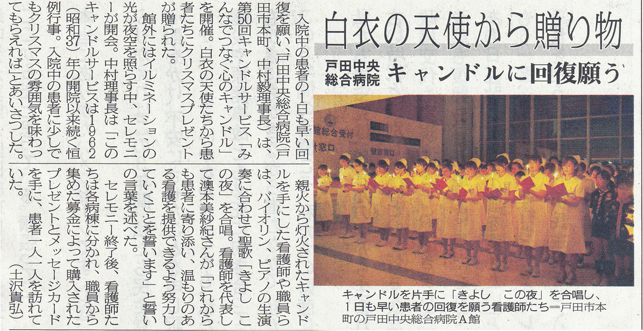 昨日の埼玉新聞朝刊に、戸田中央総合病院で行われたキャンドルサービスが記事掲載されていました。