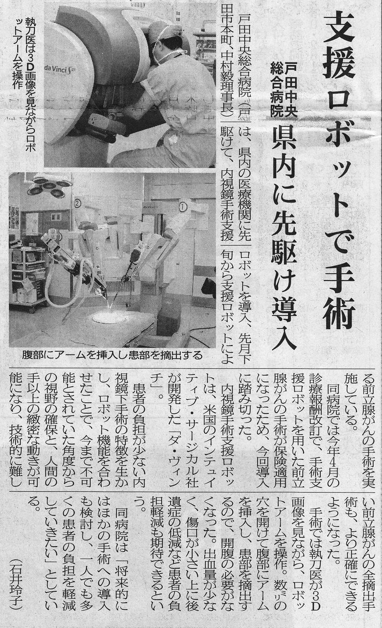 以前このブログで戸田中央総合病院に導入された内視鏡手術支援ロボット「ダ・ヴィンチ」のことを紹介したことがありましたが、今日の埼玉新聞に記事掲載されていました。