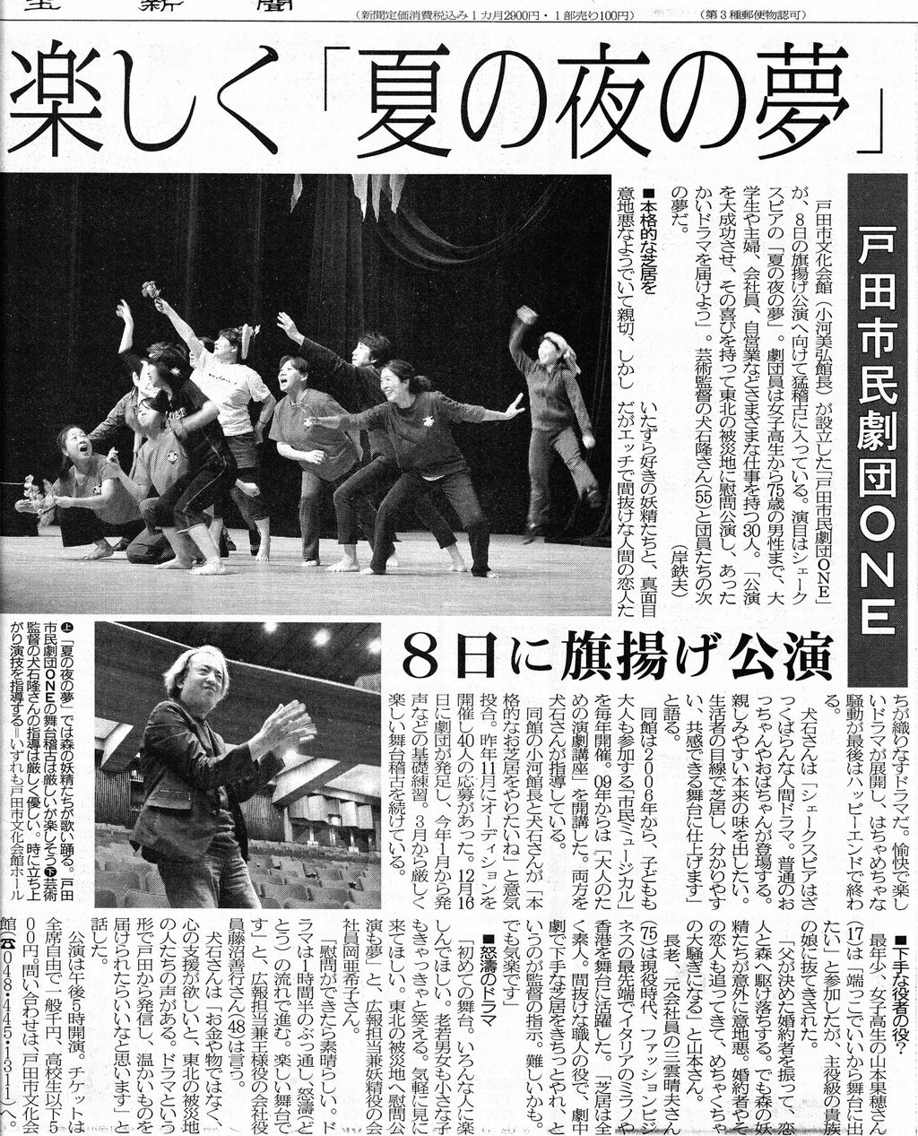 このブログでもお知らせしましたが、戸田市初となる市民劇団・戸田市民劇団ONEの旗揚げ公演が、本日の埼玉新聞17面に大きく掲載されました。
