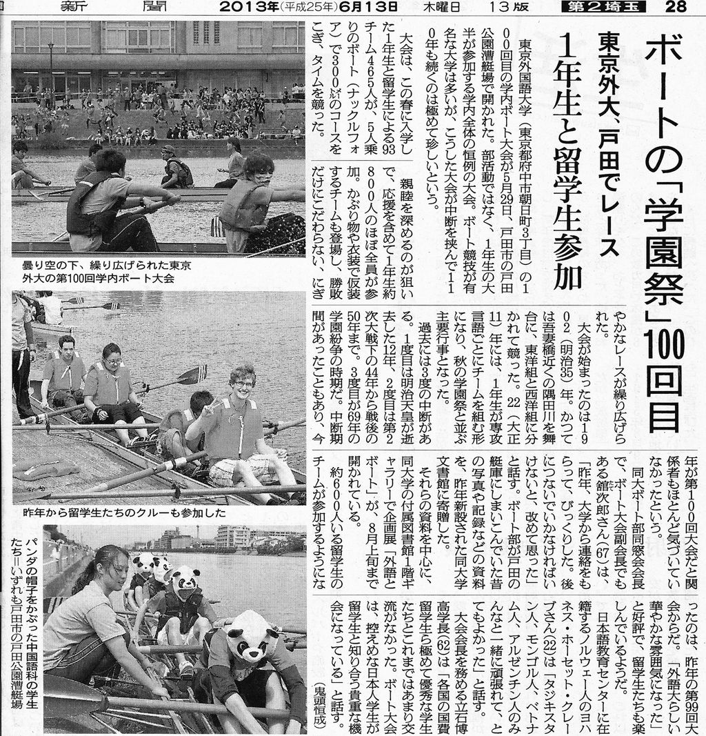 本日の朝日新聞朝刊埼玉情報欄に、「ボートの『学園祭』100回目 東京外大、戸田でレース 1年生と留学生参加」という記事が大きく掲載されていました。