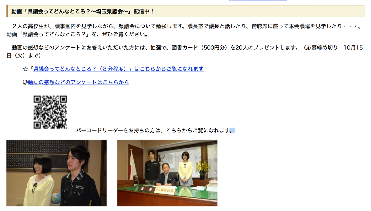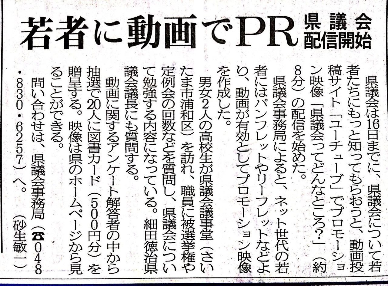 今日の埼玉新聞に「若者に動画でPR 県議会配信開始」という記事が掲載されていました。