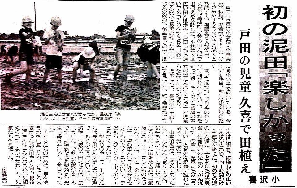 このブログでも何度かご紹介している戸田市笹目の長谷川ファームさんが久喜市菖蒲町に持っている田んぼで、今年も戸田市立喜沢小の児童たちが元気に田植え体験をしたという記事が、今日の埼玉新聞に掲載されていました。
