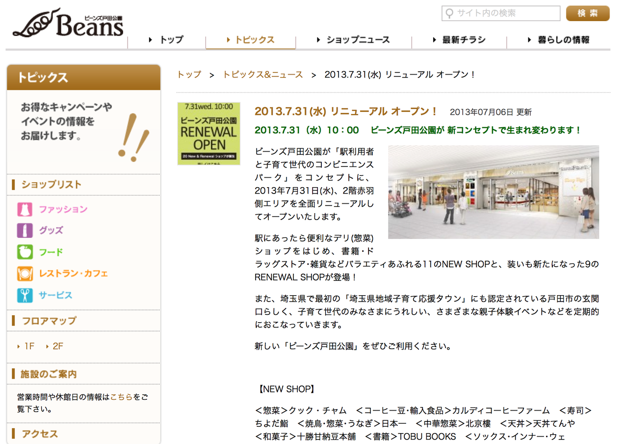 コメントをありがとうございます。そうですね。私も同感です。ビーンズは株式会社ジェイアール東日本都市開発が運営しており、戸田公園駅・戸田駅の他、近郊では武蔵浦和駅、西川口駅、赤羽駅、与野本町駅で営業していて、それぞれの駅で規模が違いますね。