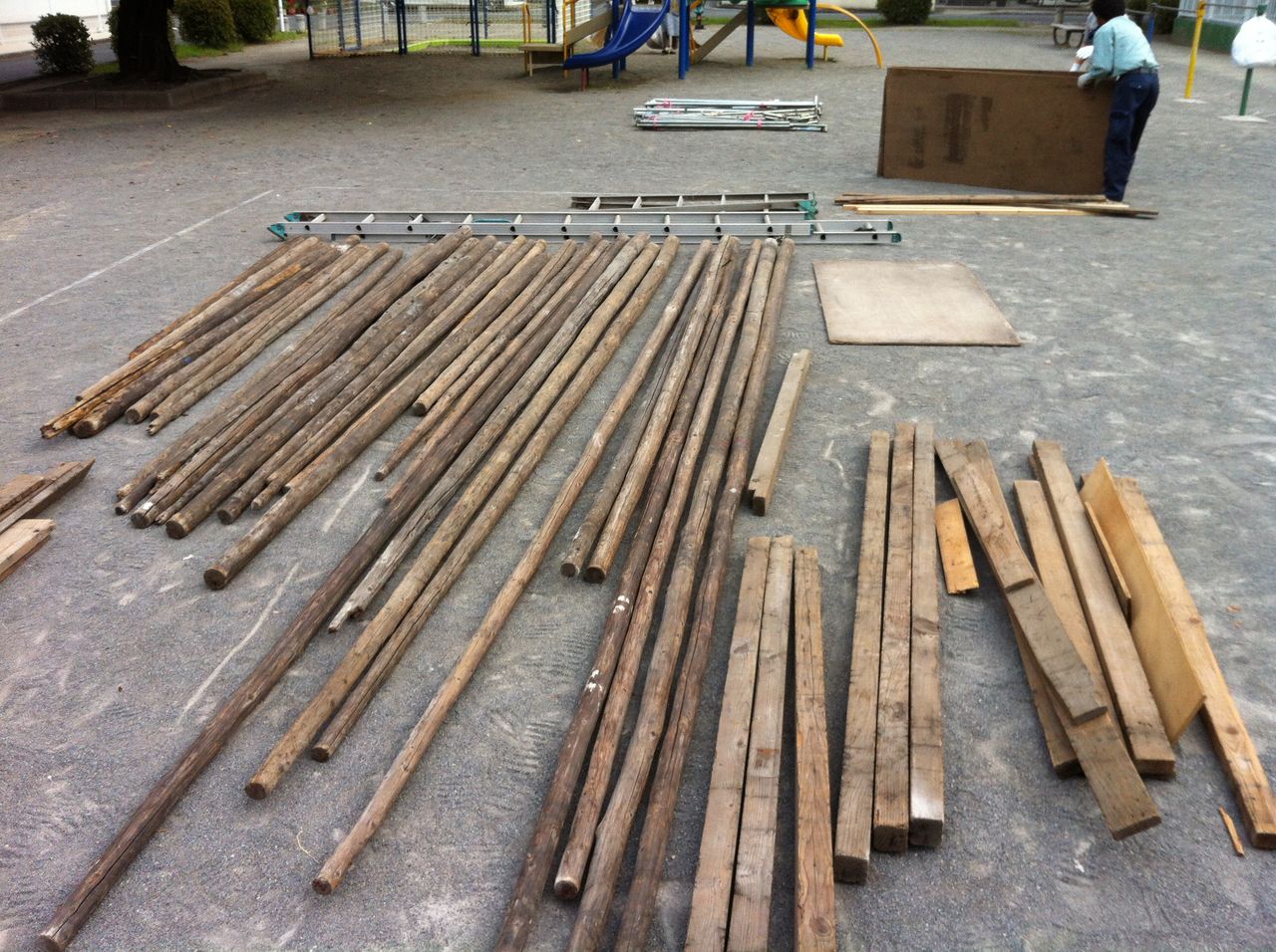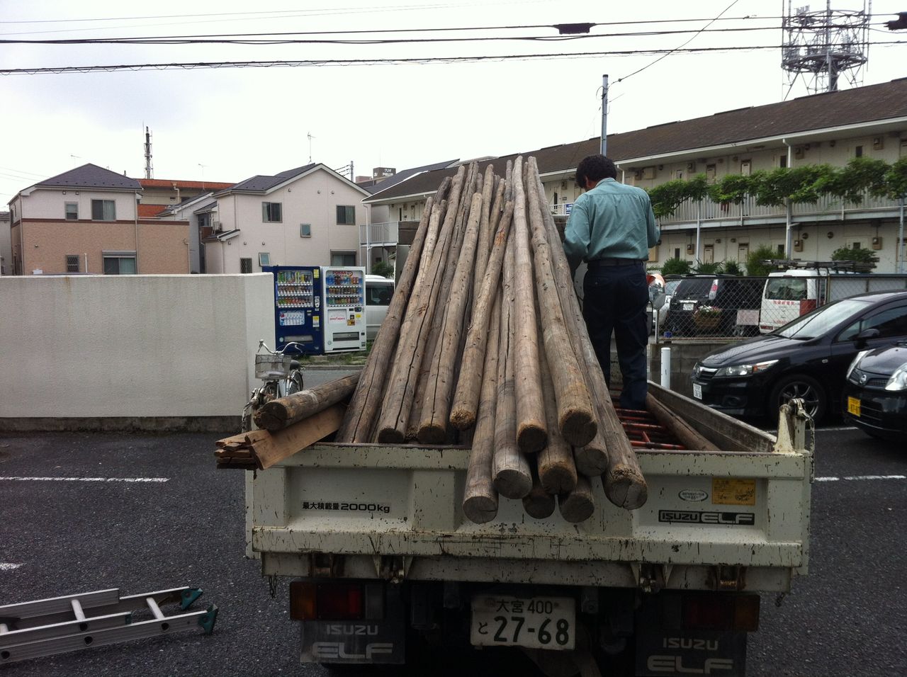 場所の鍛冶谷町公園に丸太や角材などを降ろし、長さ別に分けます。
