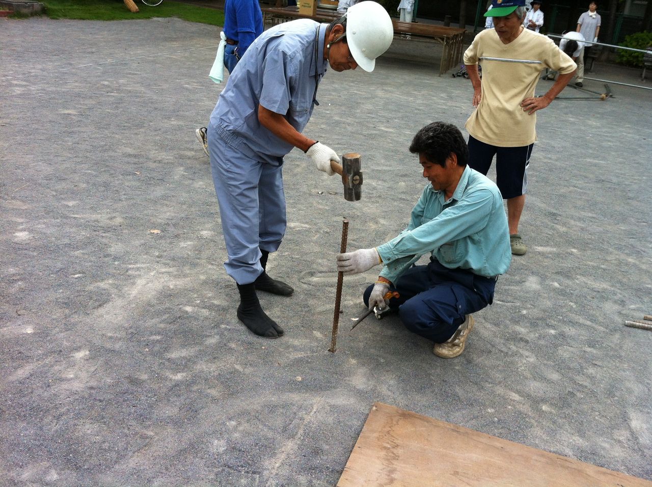 櫓を組み上げた際に、壇上に敷くベニヤ板をおき、その角から40cm斜めの地面に印を付けていきます。