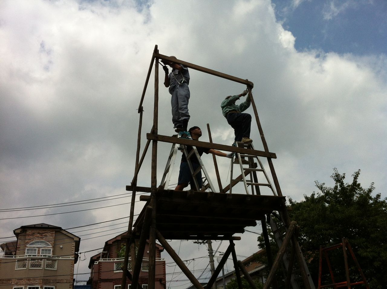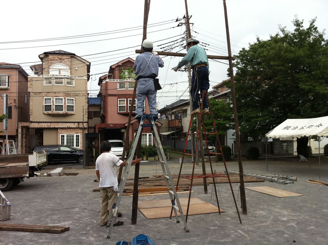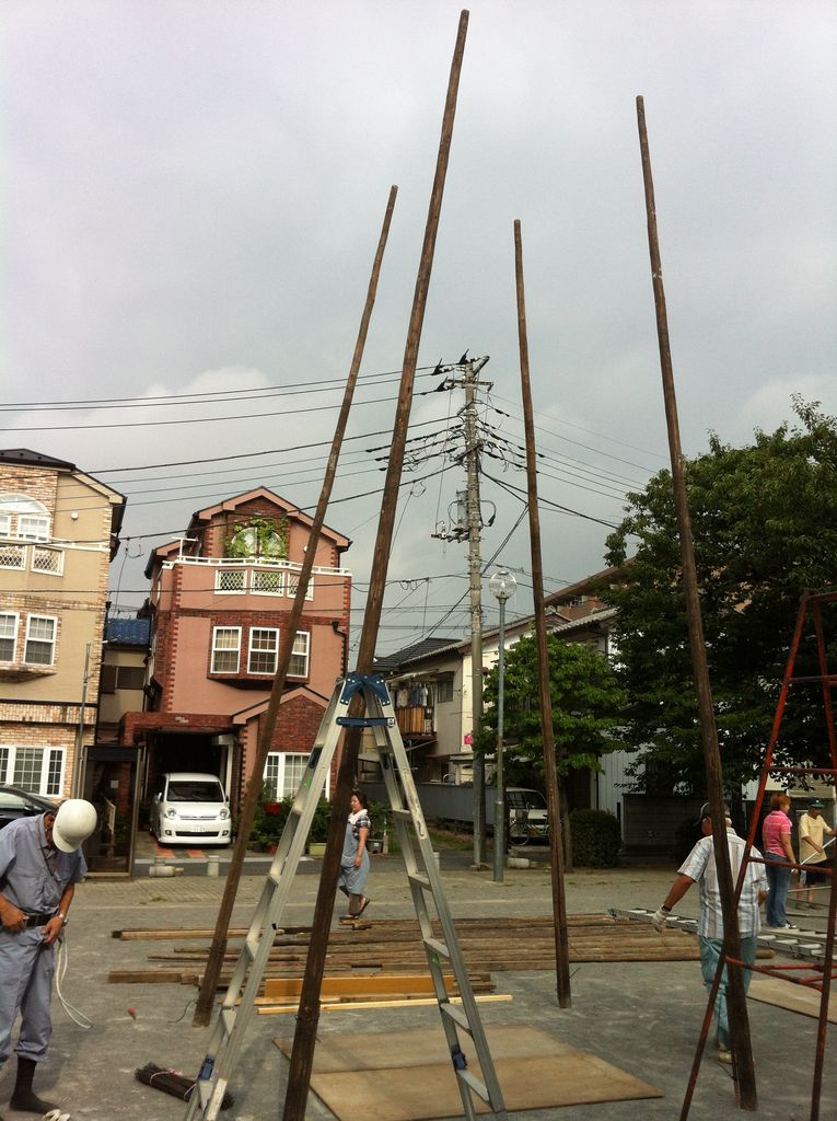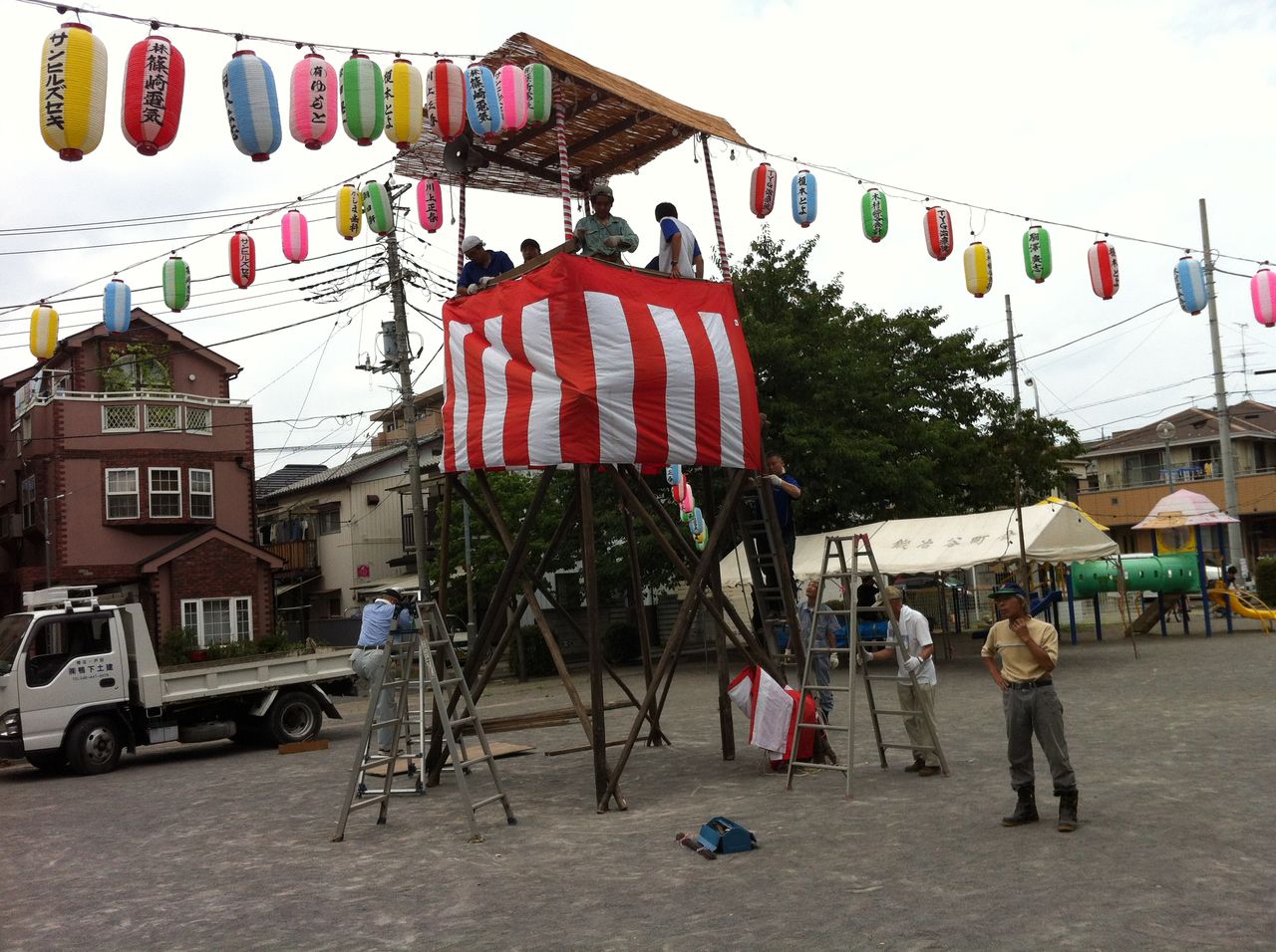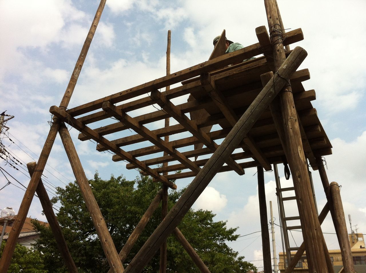 ところで、今日は午前7時より、町会盆踊りの櫓組みをやりました。