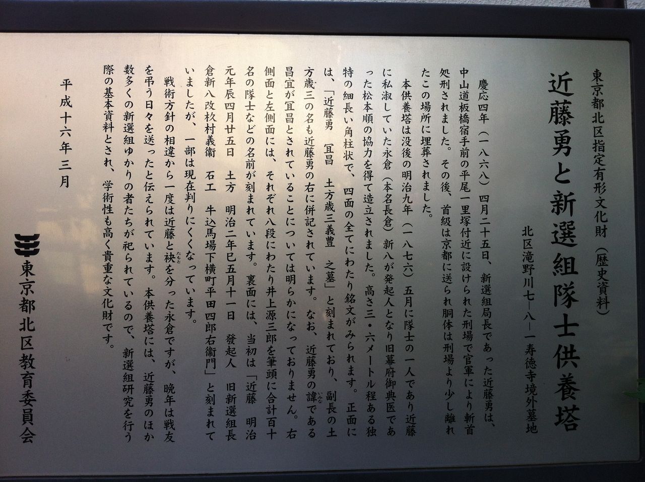 で、板橋駅の東口前に辿り着きました。そこにあるのは、ご存知、新撰組局長の近藤勇のお墓です。