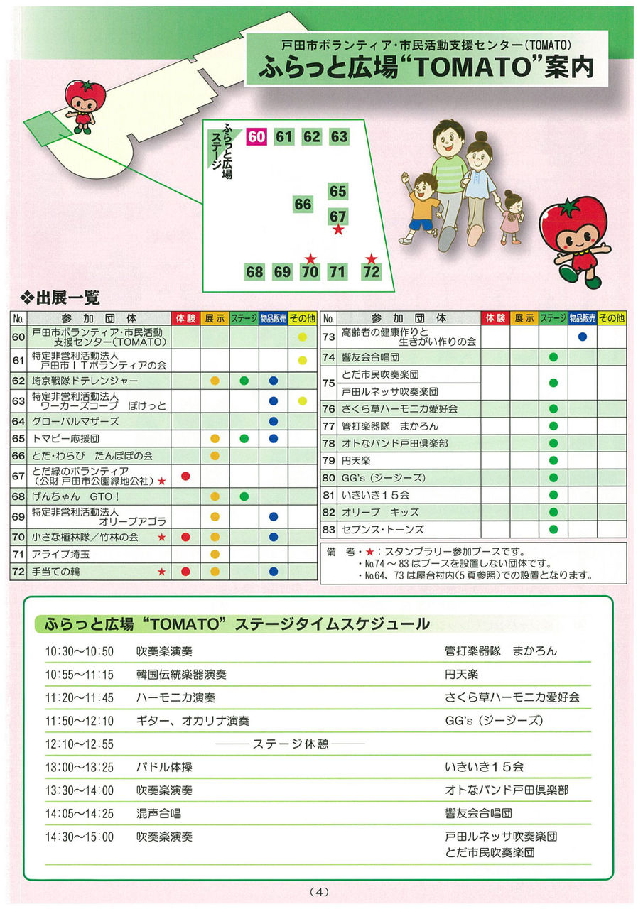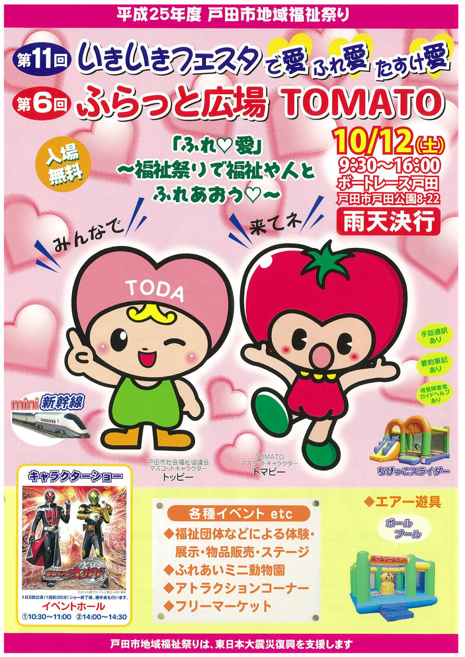 戸田市地域福祉祭りは、第6回ふらっと広場TOMATO、第11回いきいきフェスタは、戸田市ボランティア・市民活動支援センターに登録している戸田市内の市民活動団体やボランティア団体、そしてお店が集まったお祭りです。