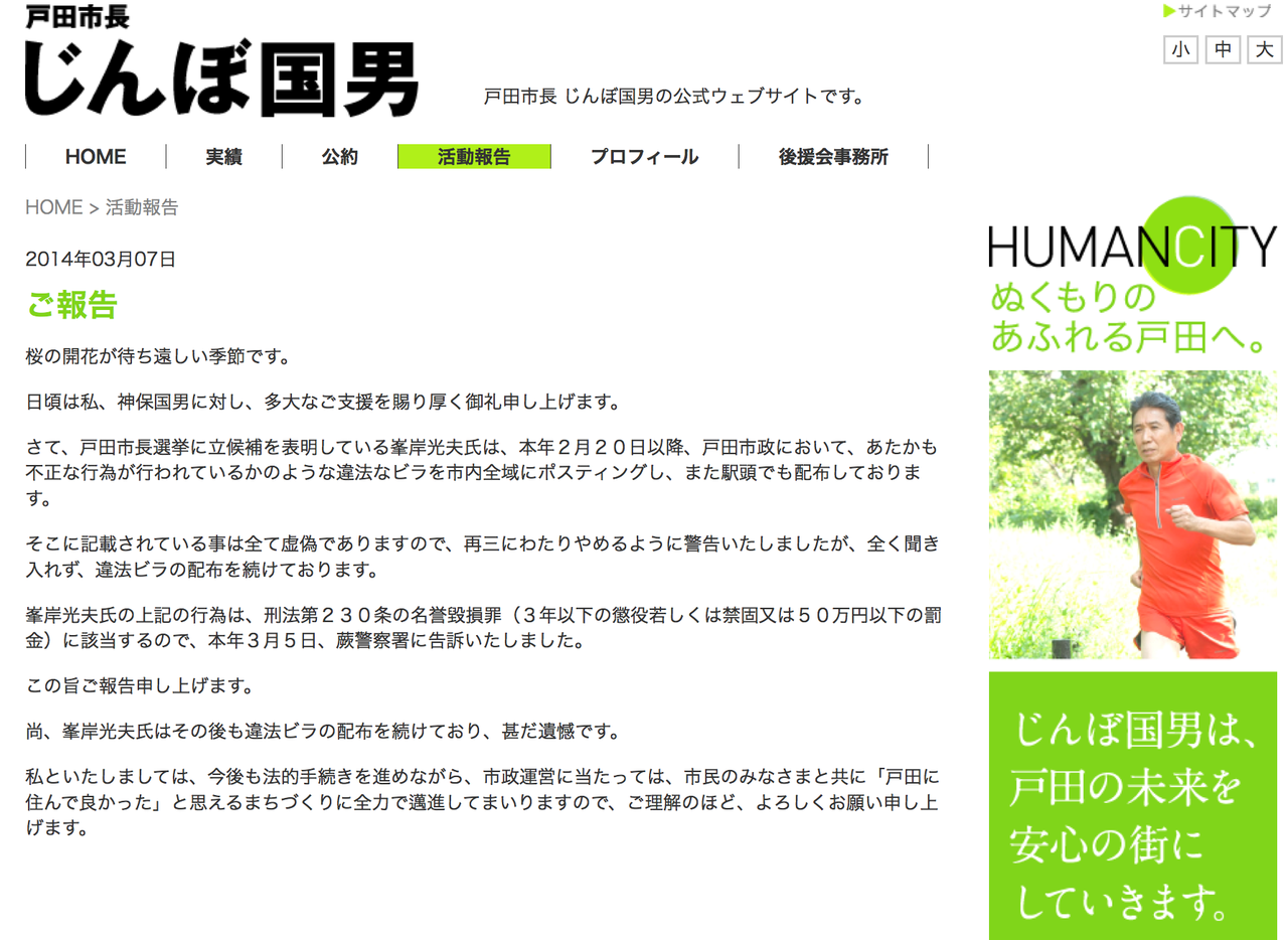 先日、埼玉新聞や朝日新聞で、市長に対する事実無根の虚偽を書いたビラを配布し注意に耳を貸さないことで峯岸光夫(みねぎし光夫)氏が告訴されたことが記事掲載されました。