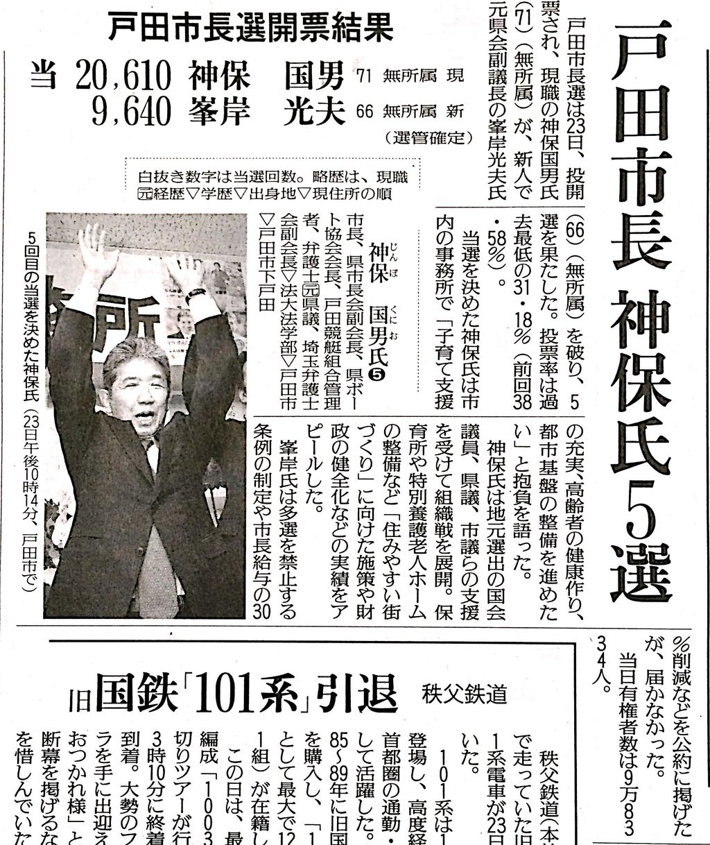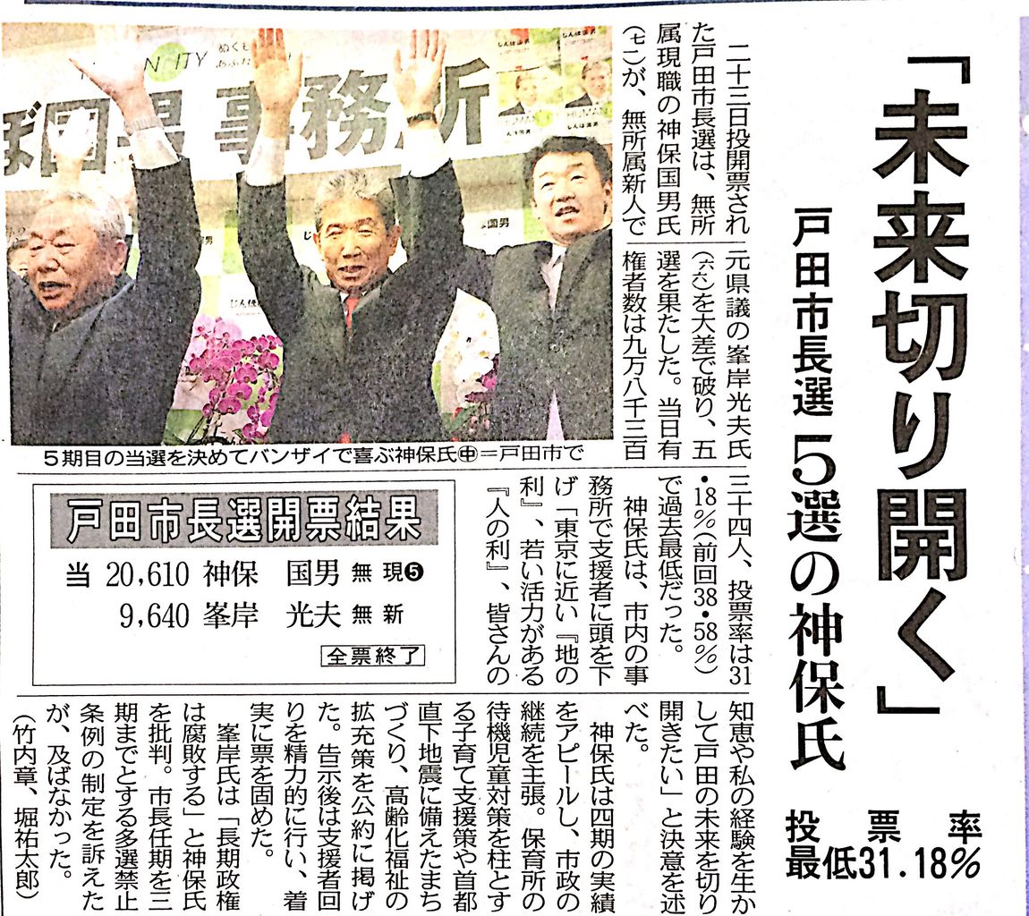低い投票率だったものの、ダブルスコアの差で神保国男氏の再選となった戸田市長選挙。