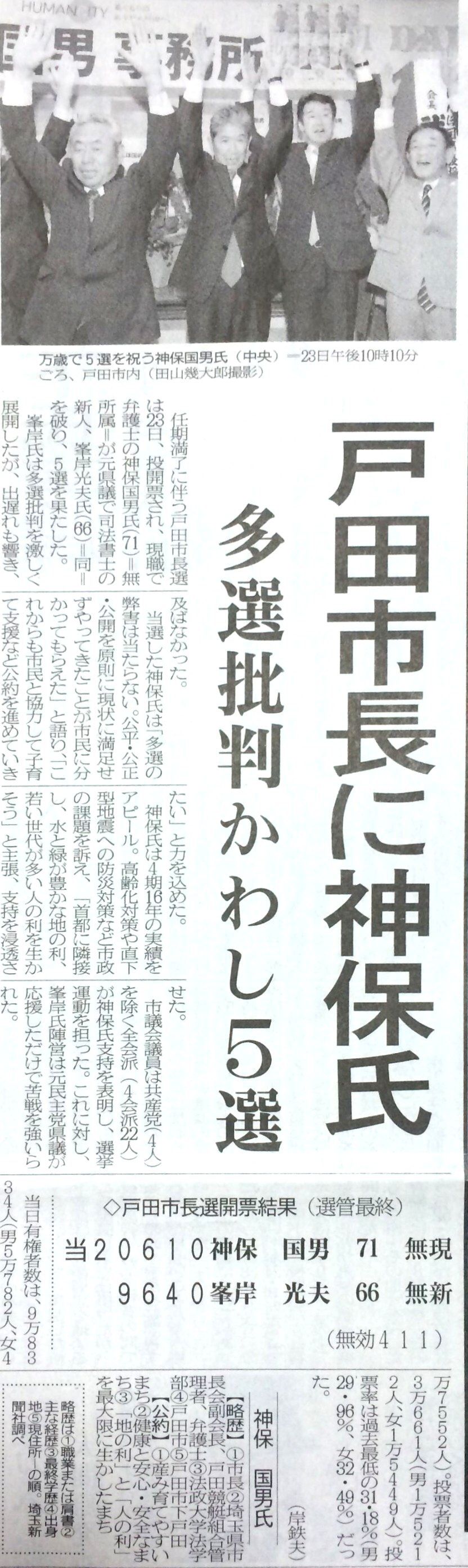 来年の4月の県議会議員選挙では右恥にいる人が真ん中に勃ち、神保市長がその隣で万歳している写真が埼玉新聞の記事になりそうな気がしてなりません。