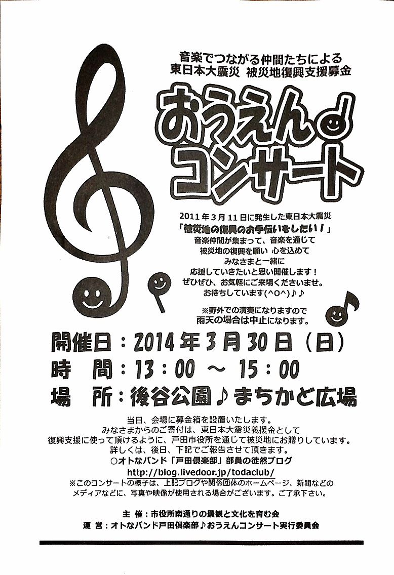 東日本大震災から3年が過ぎた今月末の最終日曜日、戸田市後谷公園まちかど広場にて、復興応援コンサートが開催されます。