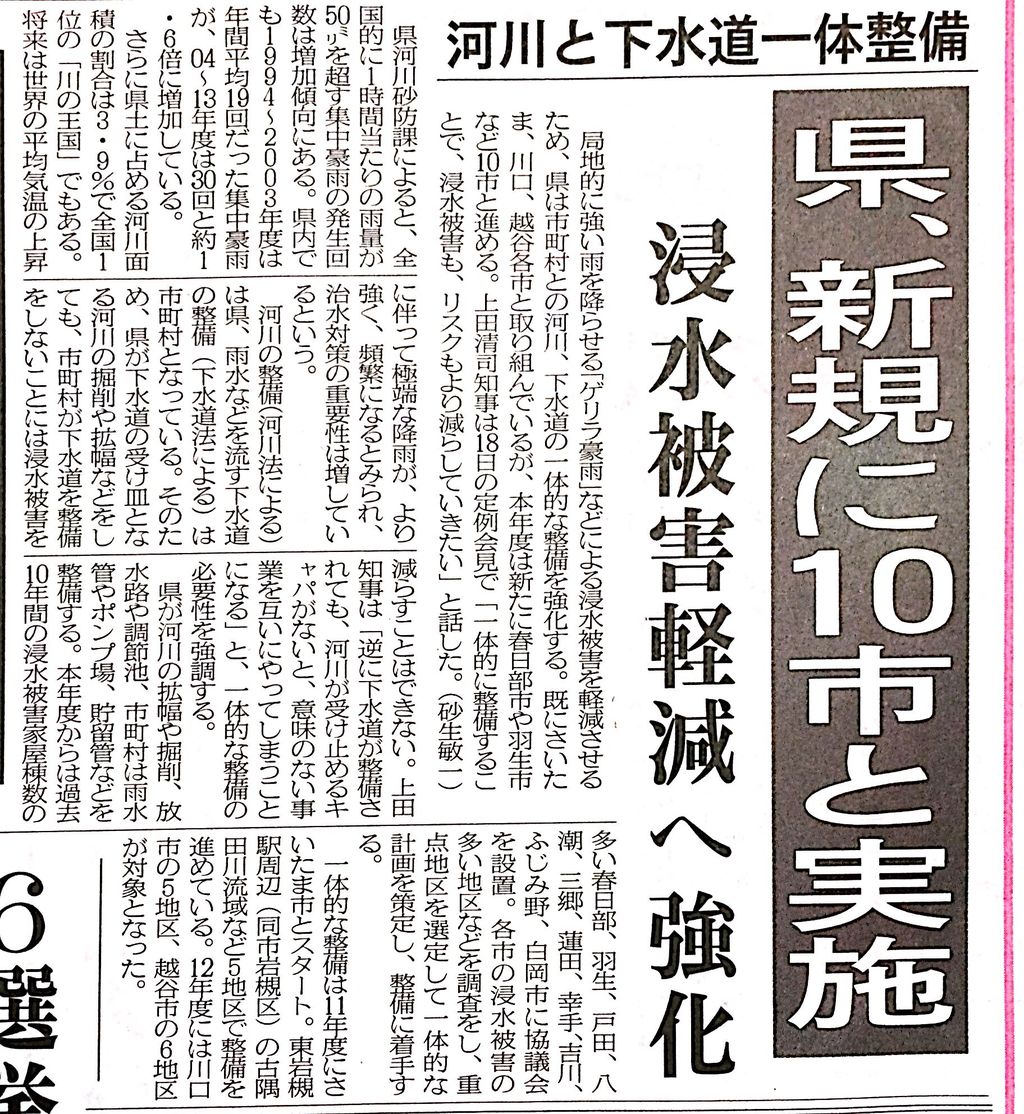 先日、戸田市の彩湖自然学習センターで「ゲリラ豪雨展」が開催されていることをお知らせいたしましたが、ゲリラ豪雨などによる浸水被害に対して、埼玉県も県内での被害の4分の3が県南・東部とさいたま市に集中していることを重視しており、今年度から戸田市を含む10市と協議会を開き、1時間あたり50ミリメートルの雨量に対する被害軽減に動くことになりました。