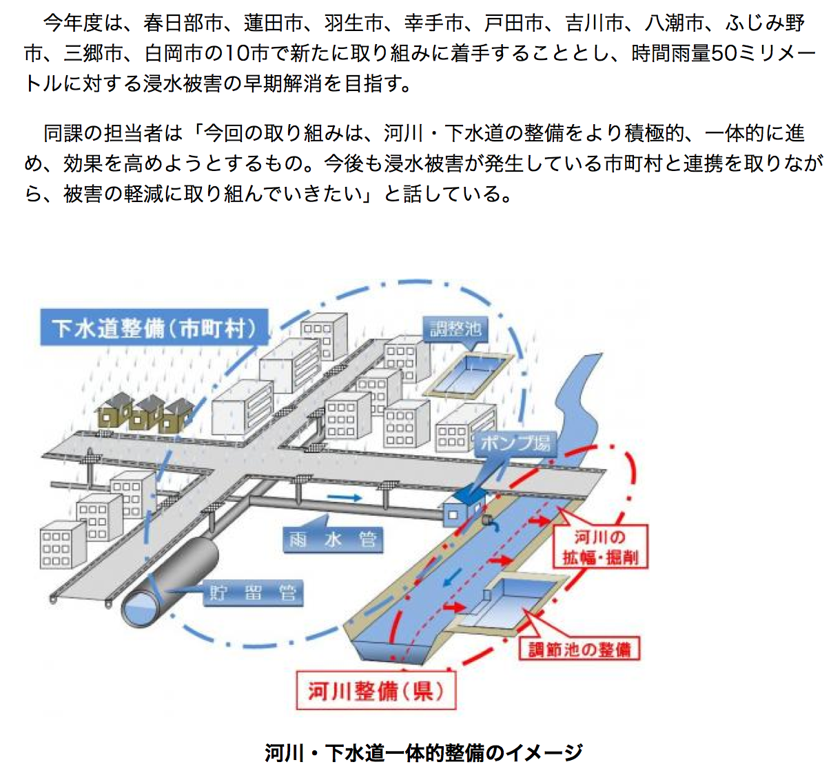 今後、戸田市と埼玉県が協議会を設置して、浸水被害が頻発する地域を対象に浸水原因を調査し、の解消に向けた河川と下水道の一体的整備に取り組むという流れになります。