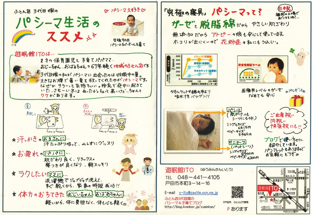 3代目さんは子育て真っ最中のご夫婦。幼子が気持ち良くたっぷりと眠れる寝具についての思いはまさに本物。身近に眠りを相談できるお店があるのはありがたいことです。
