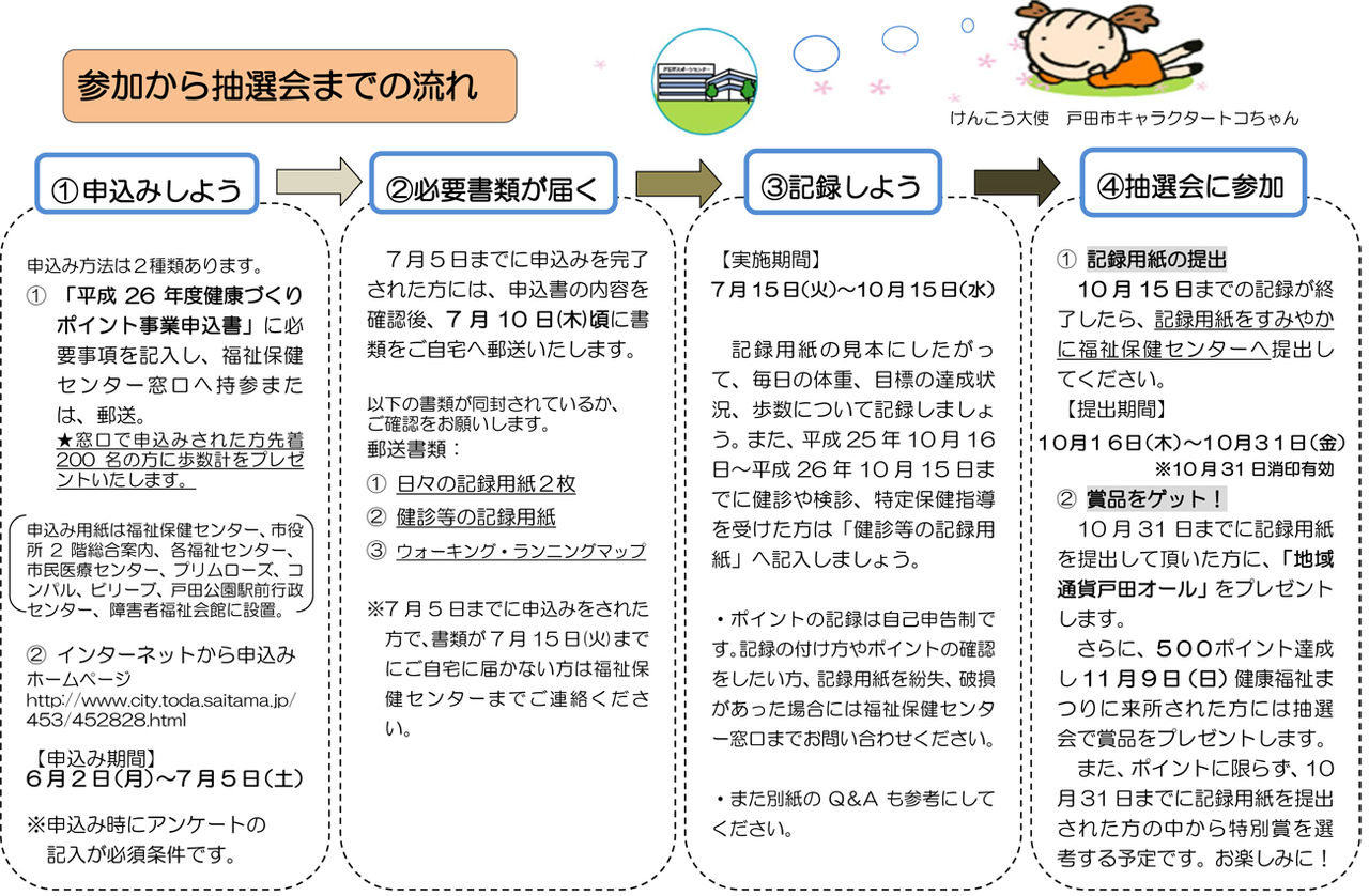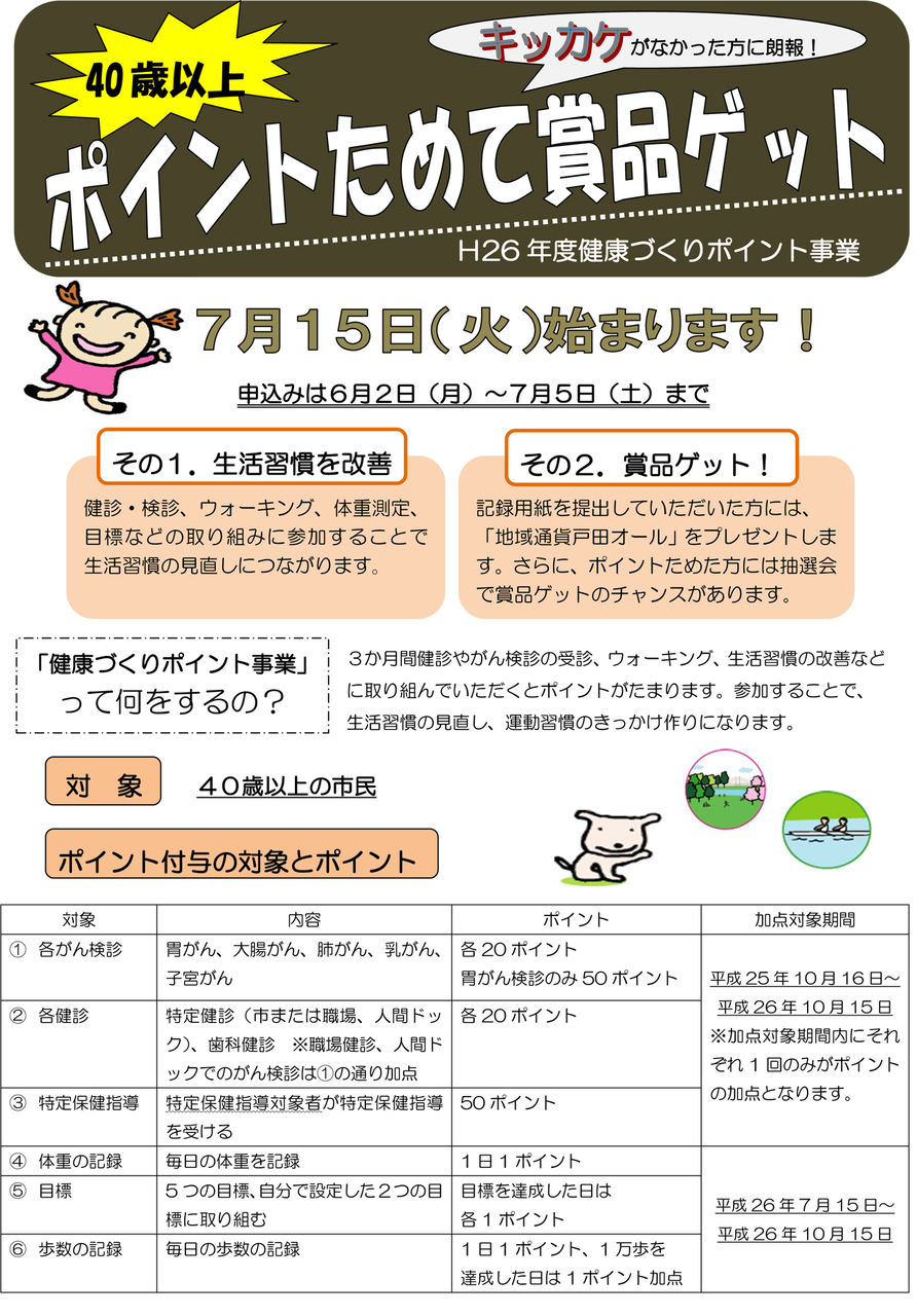 40歳以上の戸田市民を対象にしたこの企画、7月15日から10月15日までの3カ月間に、事前に計画提出した健診やがん検診の受診、ウォーキング、生活習慣の改善などに取り組むとそれぞれに設定して健康ポイントがたまり、賞品がもらえるという「健康ポイント事業」です。