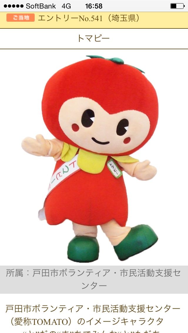 今回、戸田市からは、戸田市ボランティア・市民活動支援センターのマスコット「トマピー」、戸田市戸田ヶ原自然再生キャラクター「とだみちゃん」、TOMATO登録団体GTOのキャラクター「げんちゃん」の3つがエントリーしています。