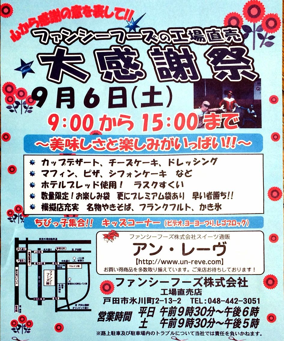 2014年09月05日 ファンシーフーズ工場直売 9月6日(土)明日開催 戸田市のスイーツ工場・ファンシーフーズさんの年に一度のお得な工場直売の日がやって来ました。 明日午前9時から午後3時まで開催です。 販売されるのは、カップデザート、チーズケーキ、ドレッシング、マフィン、ピザ、シフォンケーキ、ホテルブレッドなどなどです。 数量限定のお楽しみ袋もあるようです。 ファンシーフーズさんは、戸田市優良推奨品にも選ばれているお菓子を作っている会社。オススメです! 「お知らせ」カテゴリの最新記事 < 前の記事次の記事 > コメント コメントフォーム 名前 コメント 評価する リセット リセット 顔 星 投稿する 情報を記憶 トラックバック