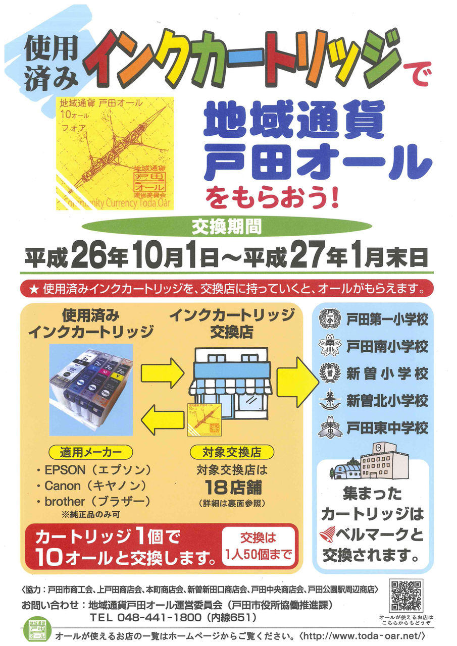 私たち地域通貨戸田オール運営委員会では、小中学校への応援に役立てる(参加できる)こと、子ども達に商店に馴染んでもらうこと等を意図して、今年も使用済みインクカートリッジと地域通貨戸田オールの交換事業を行うことになりました。