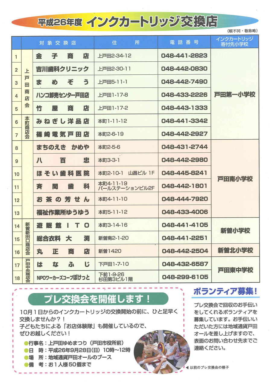 なお、チラシにもありますが、9月28日に戸田市役所西側で開催される上戸田ゆめまつり会場にて、プレ交換会を行います。10時から12時までの時間限定ですが、どうぞお持ちよりください。