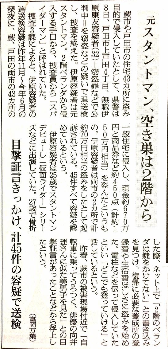 朝日29面の見出しは「元スタントマン、空き巣は2階から 目撃証言きっかけ、計45件の容疑で送検」。