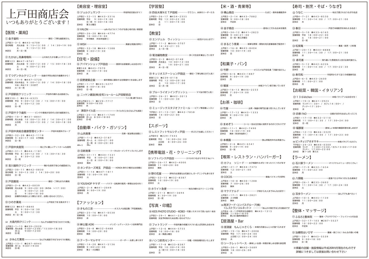 昨年の上戸田ゆめまつりで製作したものですが、この1年間で上戸田商店会に参加する店舗の変更もあったため、2014年版として製作しました。これは今度の上戸田ゆめまつりに出店される店舗でも配布されます。