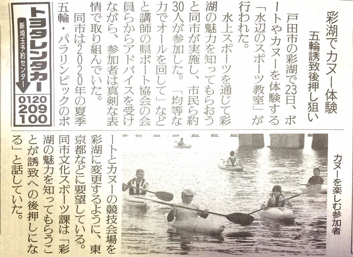 昨日は埼玉新聞に掲載された記事を紹介しましたが、本日の読売新聞には、昨日戸田市の彩湖で開催された水辺のスポーツ教室が記事掲載されていました。