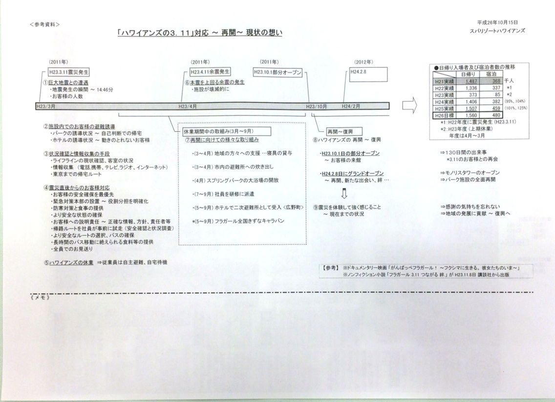 3月11日の震災と4月11日の直下型地震の余震で一部壊滅的な被害が出たハワイアンズスパリゾートですが、自ら被災者である従業員の方々自身が、お客様や被災者の方々に惜しみない支援を行った様が語られました。