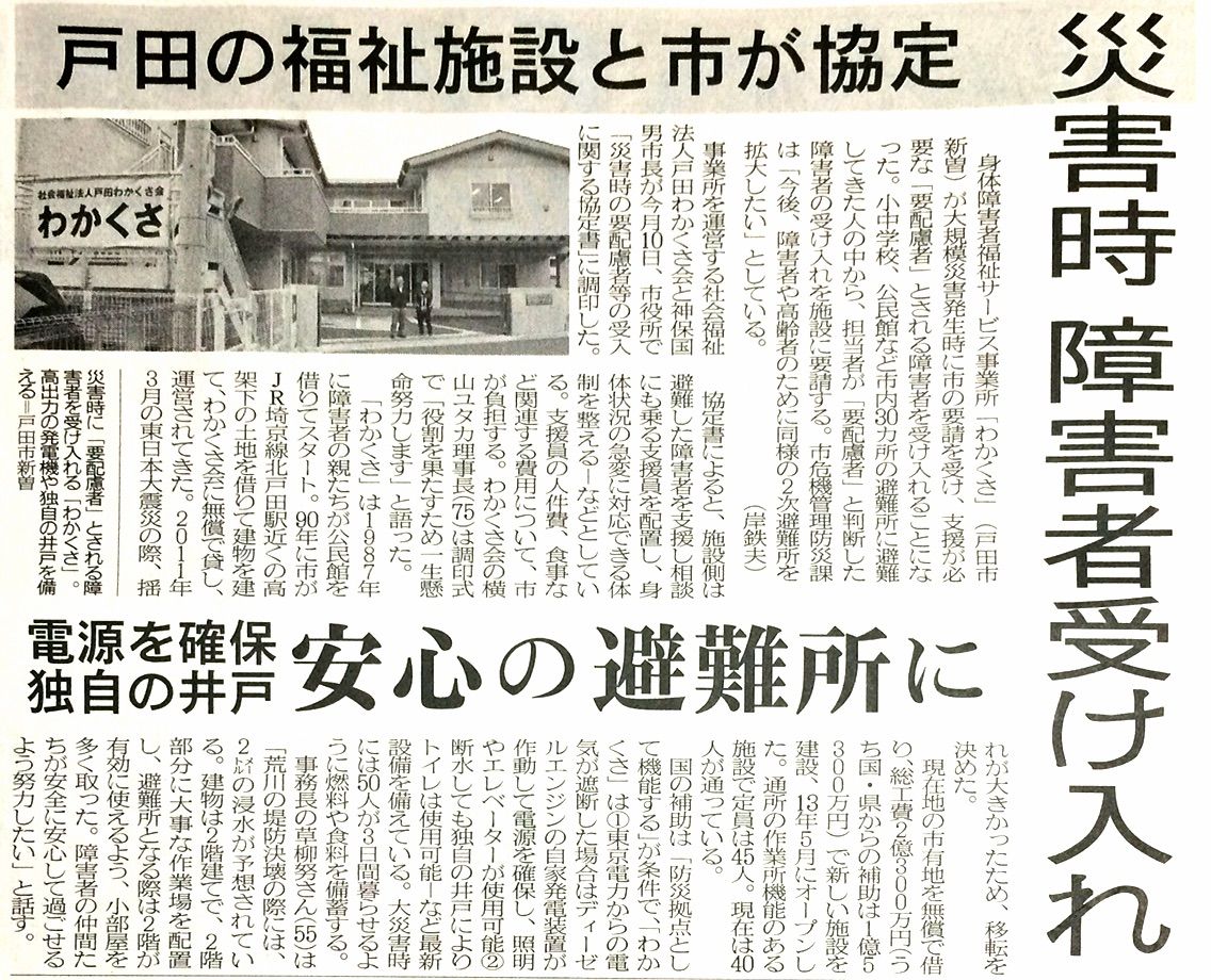 この度、戸田市は身体障害者福祉サービス事業所「わかくさ」と大規模災害発生時に支援が必要とされる要配慮者とされる障害者を受け入れる協定を結び、今朝の埼玉新聞に記事掲載されました。