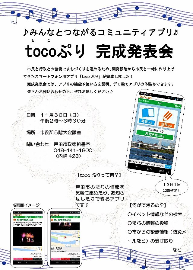 tocoぷりは12月1日に運用開始で、その前日の11月30日午後2時から戸田市役所5階大会議室で完成発表会が開催されます。