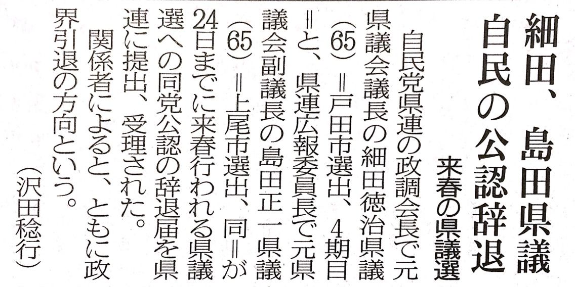 2014年12月25日 (埼玉新聞)「細田、島田県議 自民の公認辞退 来春の県議選」「6選挙区で県議選候補募集 自民県連」 数日前に聞いていましたが・・・埼玉2面「細田、島田県議 自民の公認辞退 来春の県議選」「6選挙区で県議選候補募集 自民県連」記事です。 細田徳治氏は戸田市選出、島田氏は上尾市選出。 自民党の公募が行われるのは、南3区(さいたま市西区)、南13区(上尾市・伊奈町)、南17区(志木市)、南20区(戸田市)、南22区(和光市)、東6区(白岡市・宮代町)。 問い合わせは、自民県連(電話 048-824-3297)へ。 「埼玉県」カテゴリの最新記事 < 前の記事次の記事 > コメント コメント一覧 元さくらのしんちゃん 2015年01月04日 22:29 貴殿が出るなら今でしょ!いま! 2年前の市議選のあと、貴殿に「早まった」と申言させて戴きました。 自民党埼玉県連が公募しているのであれば、公認を得て発つか、公認の道を捨てて神保市長の右腕としてのスキルと叩き上げで戦うのか。 出馬するなら、今でしょ!いま! 林冬彦(管理人) 2015年01月08日 17:24 元さくらのしんちゃんさん、もったいないお言葉、ありがとうございます。 私もすべて把握しているわけではないのですが、今回の県議会議員選挙には、5人くらいの方が立候補されるようですね。私は応援にまわる所存です。 この戸田市をさらに住みやすいまち、輝くまちにしていきたいし、そのために力をつくすという志はそのままですが、今仕事で携わっているまちづくりや広報の現場の仕事、人材育成のNPO法人理事として責任を果たすことが重要でこれを今、途中で投げ出すわけにはいきません。もちろん次回のことは考えておりますので、ご指導いただければと思います。 元さくらのしんちゃん 2015年01月09日 22:47 あ、そうですか。残念です。 川越市の舟橋元市長や亡くなられた川口市の岡村元市長は、現職の頃党派の垣根を作らず市政推進のため全ての県議候補陣営へ激励のメッセージを送っていたそうです。 戸田市の神保市長はお仲間繋がりを最優先に行動しているようで、誠に残念でなりません。 どこまで投票率が伸ばせるのか、それだけが気掛かりです。 コメントフォーム 名前 コメント 評価する リセット リセット 顔 星 投稿する 情報を記憶 トラックバック