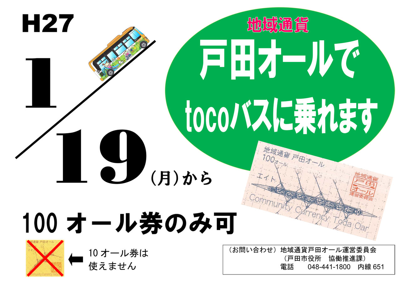 きたる1月19日より、戸田市コミュニティバス・tocoバス(運賃100円)で、地位通貨戸田オールの100オール券が利用できることになりました。