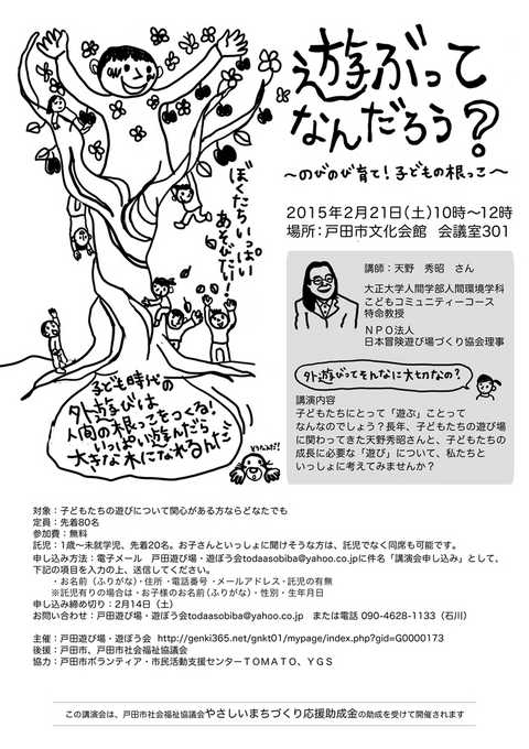 なお、この講演会終了後、13時から15時まで、戸田市文化会館南の後谷公園にて「ミニミニプレーパーク」が開催されます(雨天中止)。天野さんのお話を聞いた後に、実際に遊んでみませんか。着替えを忘れないように!