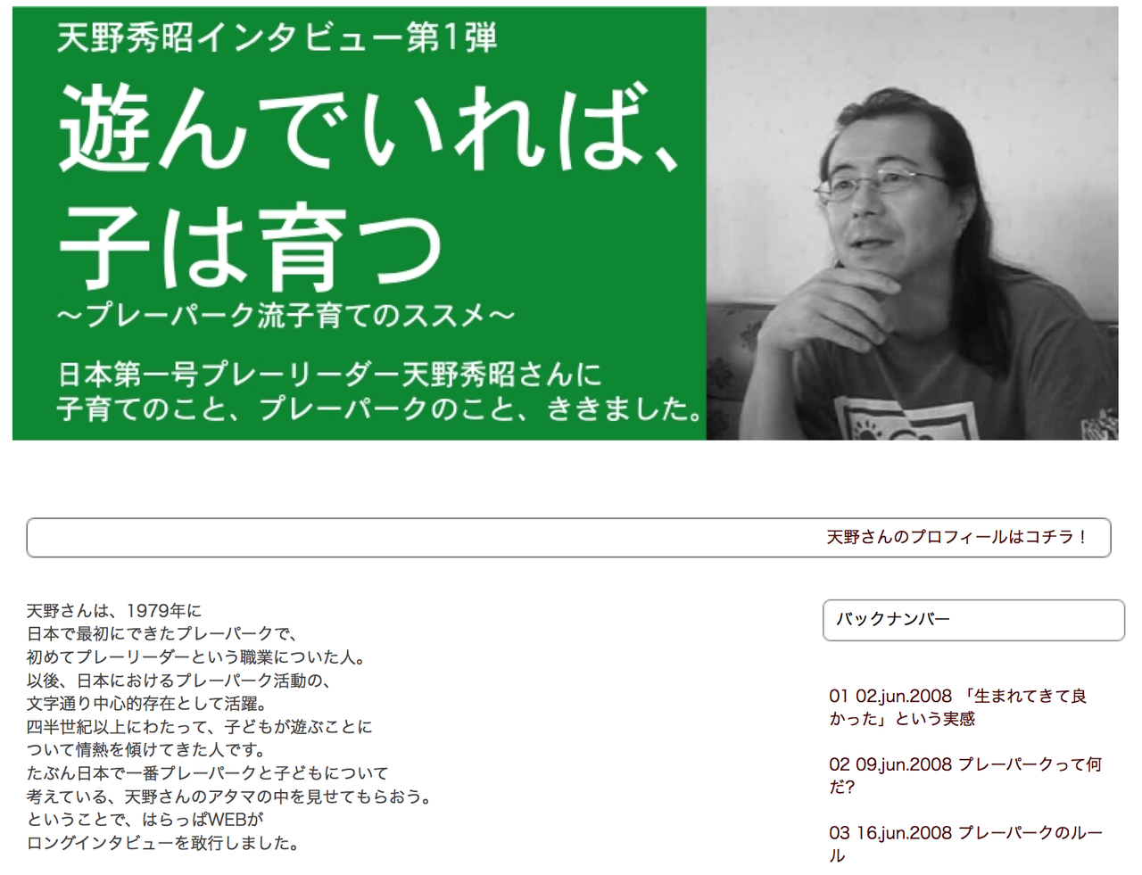 講演会「遊ぶって何だろう?〜のびのび育て!子どもの根っこ〜」。長年、子ども達の遊び場に関わって来られた「天野秀昭さん」の講演会です。天野さんは、1979年に日本で最初にできたプレーパークで初めてプレーリーダーという職業に就かれた方です(天野さんについては、この記事の下にあるリンク先のインタビューもご覧ください)。
