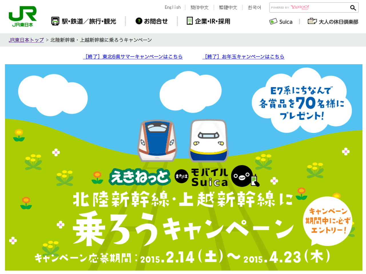 3月14日から4月23日までの期間中に、「えきねっと」か「モバイルSuica」を使って「東京〜高崎」間の駅から北陸新幹線の「飯山〜金沢」間の駅、もしくは「東京〜高崎」間の駅から上越新幹線の「越後湯沢〜新潟」までの駅の指定席券を購入された方を対象に抽選でプレゼントが当たるキャンペーンです。