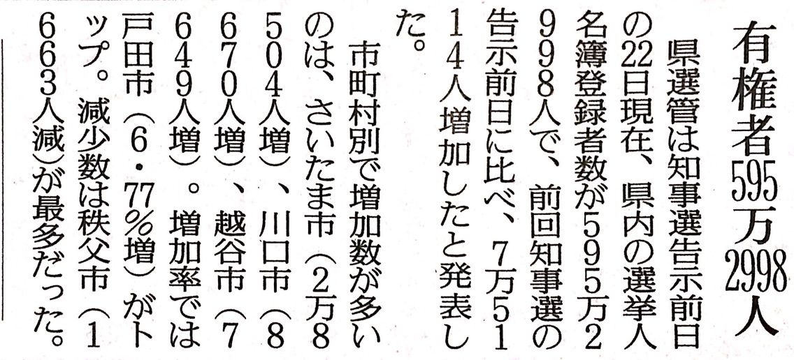 2015年07月23日 埼玉県知事選挙が告示になりました 本日、埼玉県知事選挙が告示されました。 選挙の掲示板には早速ポスターが貼られていました。 埼玉県全体の有権者は595万2998人。市町村別に見ると、増加率では戸田市が一番だそうです。 今日は不覚ながら、風邪をひいてしまったようなので、各候補者や関連サイトなどついてはまた後日紹介します。 (読売新聞 2015年7月23日朝刊35面) 「政治」カテゴリの最新記事 < 前の記事次の記事 > コメント コメントフォーム 名前 コメント 評価する リセット リセット 顔 星 投稿する 情報を記憶 トラックバック