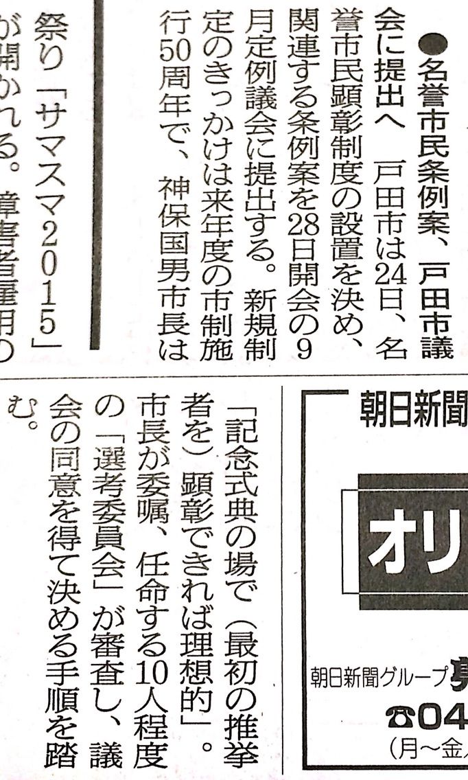 2015年08月25日 (朝日新聞)名誉市民条例案、戸田市議会に提出へ 本日の朝日新聞に「名誉市民条例案、戸田市議会に提出へ」という記事が掲載されていました。そういえば、戸田市で「名誉市民」という称号、聞いたことなかったですね。そういった制度自体がなかったのでした。来年度は、戸田市制施行50周年。来年の10月1日(土)に予定されている記念式典で、記事にあるように最初の「名誉市民」が顕彰されるかもしれませんね。(朝日新聞 2015年8月25日埼玉版朝刊29面) 「戸田市」カテゴリの最新記事 < 前の記事次の記事 > コメント コメントフォーム 名前 コメント 評価する リセット リセット 顔 星 投稿する 情報を記憶 トラックバック